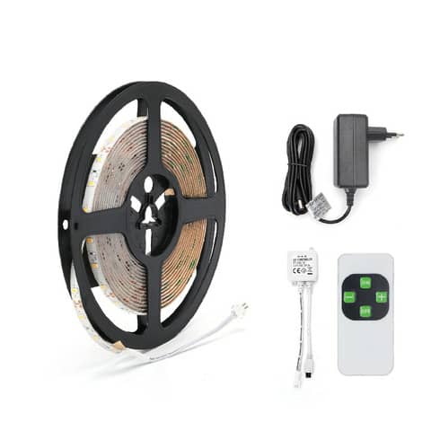 Le strisce LED a basso voltaggio hanno grande elasticità e coniugano sicurezza, facilità e praticità. Sono semplici da installare e contribuiscono a personalizzare l'estetica degli spazi interni rendendoli più ricercati. Isolamento a basso voltaggio 12V anti scossa. Sul retro della striscia è presente un potente e sottile strato adesivo facile da applicare. I chip LED ad alta luminosità illuminano in modo uniforme e hanno resa cromatica alta. I circuiti in puro rame garantiscono stabilità e durabilità. Lo strato di resina epossidica rende il prodotto impermeabile garantendo un grado di protezione IP65, adatto anche agli ambienti umidi. Pratico telecomando per regolare la luminosità con portata di circa 5 metri, batteria a bottone CR2023 3V. Garanzia di 2 anni se verificato che tutte le operazioni sono state svolte correttamente. Luminosità regolabile con il telecomando. Vita utile 20.000 ore. Lunghezza del cavo 1,5 m. Dimensioni rotolo ø177 x H. 8 mm. Dimensioni striscia L. 5 m x P. 8 mm. Potenza 18W. Temperatura di colore 3000K. Flusso luminoso 1200 lumen. Voltaggio DC12V. Intensità corrente MAX.2000mA. Frequenza 50/60Hz. Angolo di illuminazione 120°. Grado di protezione IP65. Ambiente interno. Temperatura -20?~40?. Materiali principali PU & rame. Certificazione CE.