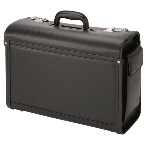 Borsa Pilota in similpelle dotata di uno scomparto principale, due chiusure a combinazione, scomparto a chiusura lampo, tre passanti per penne sul lato dell'apertura e scompartimento su un lato. Colore: nero.