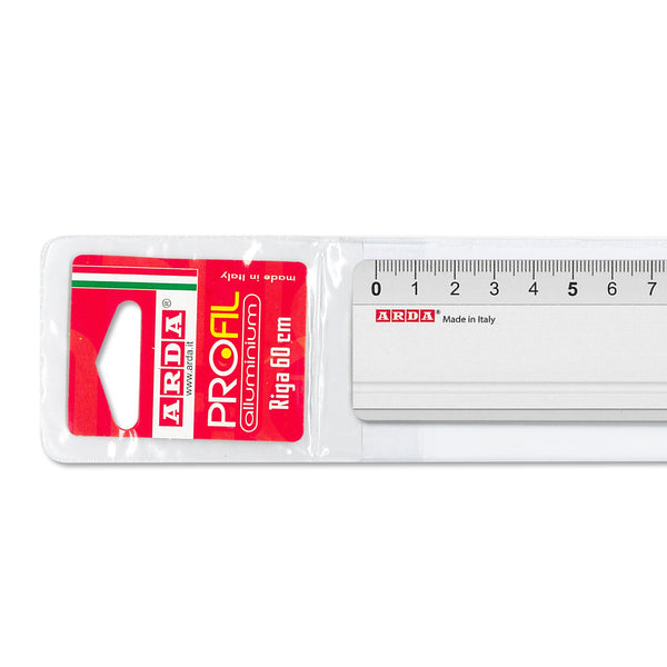 Articolo di precisione in alluminio anodizzato. Riga dotata di smusso bianco. Listello in gomma antisdrucciolo. Confezione in busta di pvc.