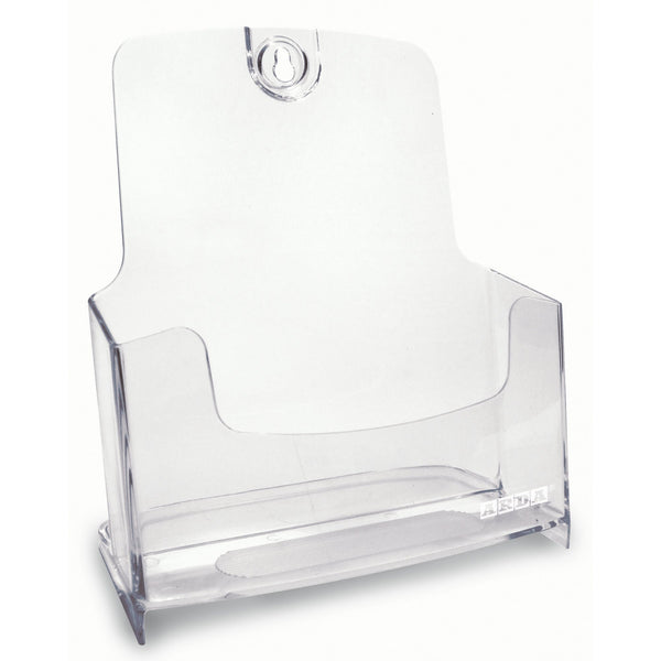 Portadepliant da parete e da banco a tasca singola f.to a5. Design pulito ed essenziale, possono entrare uno nell'altro cosi' da guadagnare spazio sul banco. In materiale plastico perfettamente trasparente con dorso leggermente inclinato per garantire la massima stabilita' del materiale esposto. Accoppiabili ad incastro e appendibili a parete. Dimensione 17,3x19,7x10,1cm.