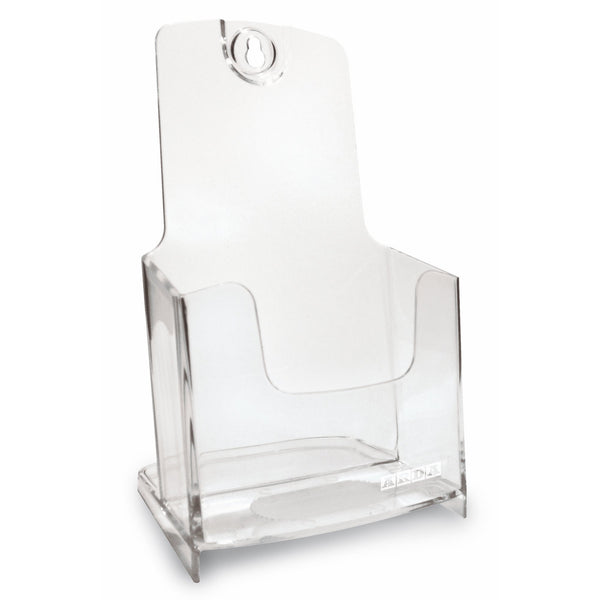 Portadepliant da parete e da banco a tasca singola f.to 1/3 a4. Design pulito ed essenziale, possono entrare uno nell'altro cosi' da guadagnare spazio sul banco. In materiale plastico perfettamente trasparente con dorso leggermente inclinato per garantire la massima stabilita' del materiale esposto. Accoppiabili ad incastro e appendibili a parete. Dimensione 11,7x19,5x10,1cm.