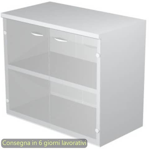 Mobile basso della linea Presto, una linea operativa contemporanea progettata per un utilizzo quotidiano ed intensivo in grado di soddisfare tutte le esigenze funzionali ed estetiche. La gamma completa degli elementi permette di allestire ogni ambiente di lavoro, personalizzandolo con stile. Scrivanie con dimensioni conformi alle normative sulla sicurezza dei posti di lavoro in ufficio. Dimensioni L. 80 x P. 35 x H. 72 cm. Top sp. 22 mm. Struttura, ante e ripiani sp. 18 mm. Un ripiano regolabile in altezza con un sistema di bloccaggio nella posizione desiderata. Ante in vetro satinato senza serratura. Il mobile, rifinito posteriormente nello stesso colore della struttura, può essere utilizzato come parete divisoria. Dotato di piedini regolabili in altezza per un perfetto livellamento sul pavimento. Imballi in cartone riciclato alto spessore a tutela dell’ambiente. Produzione certificata conforme alle procedure UNI EN ISO 9001. Certificazioni FSC e PEFC. Struttura grigia.