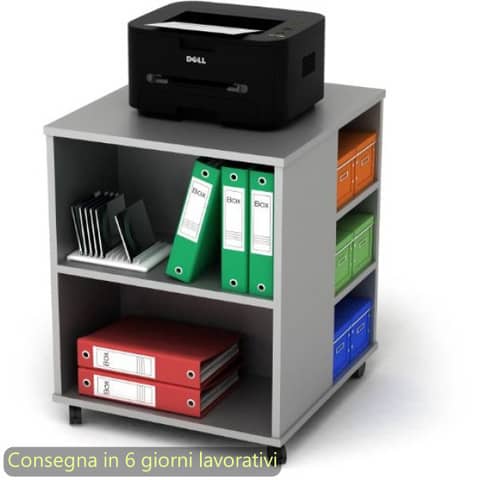 Mobile di servizio multifunzione su ruote per fax,stampante, fotocopiatrice e classificatori. Colore grigio. Struttura in bilaminato melaminico spessore 1,8 cm classe E1. Top: 60x56 cm. Ripiani regolabili in altezza. Con i due ripiani nella posizione centrale le dimensioni dei due vani a giorno grandi misurano 51,6x29xH.29 cm. Abbinabile alla linea Presto. Dimensioni: 56x60xH.70,5 cm. Imballo in cartone riciclato a tutela dell'ambiente. Produzione certificata conforme procedure UNI EN ISO 9001.