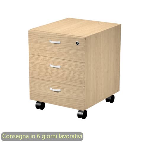 Cassettiera a 3 cassetti su ruote con serratura sul 1° cassetto. Colore rovere chiaro. Ruote con freno. La cassettiera viene fornita montata, ed è posizionabile sul lato lungo, a destra o sinistra, oppure adiacente al lato da 80 del tavolo sempre a destra o sinistra. I cassetti hanno le guide metalliche con fermo a fine corsa. Dimensioni: 41,5x49,5xH.57,6 cm. Produzione interna Artexport della parte in legno certificata Iso 9001. Certificazioni FSC e PEFC. Imballi totalmente in cartone per un facile riciclo, a basso impatto ambientale.