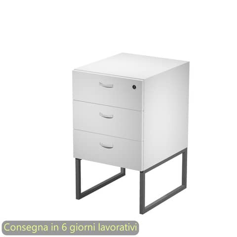 Cassettiera alta a 3 cassetti bianco cera su supporto in metallo antracite opaco. La serratura si trova sul primo cassetto. Senza ruote. I cassetti hanno guide metalliche con fermo a fine corsa. I piedini sono regolabili, in modo da permettere il posizionamento della cassettiera sotto il piano della scrivania. Fornita montata. Il supporto in metallo è da montare. Dimensioni: 41,5x50xH.72,2 cm. Produzione interna Artexport della parte in legno certificata Iso 9001. Certificazioni FSC e PEFC. Imballi totalmente in cartone per un facile riciclo, a basso impatto ambientale. Consegnata con scocca montata, supporto da montare.