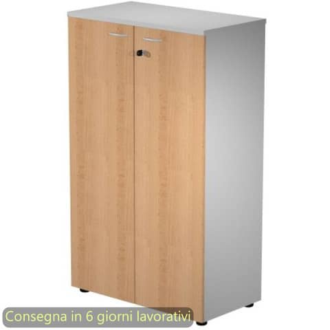 Mobile medio della linea Presto, una linea operativa contemporanea progettata per un utilizzo quotidiano ed intensivo in grado di soddisfare tutte le esigenze funzionali ed estetiche. La gamma completa degli elementi permette di allestire ogni ambiente di lavoro, personalizzandolo con stile. Scrivanie con dimensioni conformi alle normative sulla sicurezza dei posti di lavoro in ufficio. Dimensioni L. 80 x P. 44 x H. 120 cm. Top sp. 22 mm. Struttura, ante e ripiani sp. 18 mm. Due ripiani regolabili in altezza con un sistema di bloccaggio nella posizione desiderata. Ante in melaminico con una pratica serratura. Il mobile, rifinito posteriormente nello stesso colore della struttura, può essere utilizzato come parete divisoria. Dotato di piedini regolabili in altezza per un perfetto livellamento sul pavimento. Imballi in cartone riciclato alto spessore a tutela dell’ambiente. Produzione certificata conforme alle procedure UNI EN ISO 9001. Certificazioni FSC e PEFC. Struttura color grigio alluminio, ante di colore faggio.