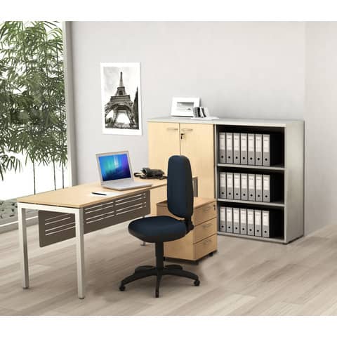 Mobile a giorno alto con tre ripiani extra profondità Venere Plus, una linea economica ma caratterizzata da soluzioni tecniche di livello superiore. Una serie di componenti con dimensioni conformi alle normative sulla sicurezza dei posti di lavoro in ufficio.