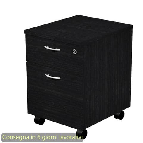 Cassettiera della linea Presto dotata di 1 cassetto con serratura ed 1 ampio classificatore per cartelle sospese con interasse 33 cm. Cassetti scorrevoli su guide metalliche con fermo a fine corsa. Dimensioni L. 43 x P. 52 x H. 59,5cm. Cassettiera su ruote pivotanti, smontate e con freno, con meccanismo antiribaltamento per un facile e sicuro spostamento. Schiena in tinta con la struttura. Materiale melaminico bilaminato antigraffio ed antiriflesso conforme alle norme UNI e EN classe E1. La cassettiera viene venduta e consegnata smontata. Produzione certificata conforme alle procedure UNI EN ISO 9001. Certificazioni FSC e PEFC. Prodotto da assemblare. Colore nero venato frassino.