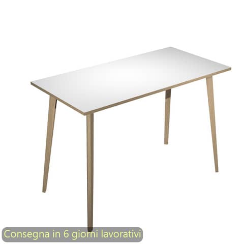 Tavolo alto della linea K143 Woody, una linea di arredo operativa dal design innovativo e dinamico, caratterizzata da gambe in legno massello cilindriche inclinate. L'ideale per l’arredo di punti ristoro e per l’allestimento di postazioni di appoggio per veloci riunioni ed incontri di lavoro. Dimensioni L. 160 x P. 80 x H. 105 cm. Materiale bilaminato nobilitato melaminico spessore 22 mm conforme norme UNI e EN classe E1. Robusto piano in melaminico sp. 22 mm con bordo antishock resistente agli urti in ABS 2 mm, antigraffio e antiriflesso. Gambe in legno massello (d. 50 mm) complete di piedini livellabili in altezza. Particolarmente stabile e robusto grazie alla struttura rafforzata da quattro travi in metallo di collegamento fra le gambe. Disponibile anche nella versione con le gambe in metallo al codice ... Certificazioni FSC e PEFC. Colore del piano bianco con bordi rovere.