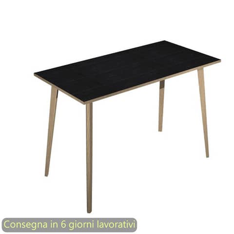 Tavolo alto della linea K143 Woody, una linea di arredo operativa dal design innovativo e dinamico, caratterizzata da gambe in legno massello cilindriche inclinate. L'ideale per l’arredo di punti ristoro e per l’allestimento di postazioni di appoggio per veloci riunioni ed incontri di lavoro. Dimensioni L. 160 x P. 80 x H. 105 cm. Materiale bilaminato nobilitato melaminico spessore 22 mm conforme norme UNI e EN classe E1. Robusto piano in melaminico sp. 22 mm con bordo antishock resistente agli urti in ABS 2 mm, antigraffio e antiriflesso. Gambe in legno massello (d. 50 mm) complete di piedini livellabili in altezza. Particolarmente stabile e robusto grazie alla struttura rafforzata da quattro travi in metallo di collegamento fra le gambe. Disponibile anche nella versione con le gambe in metallo al codice ... Certificazioni FSC e PEFC. Colore del piano nero venato frassino con bordi rovere.