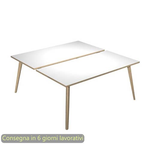 Scrivania con due postazioni contrapposte senza pannello divisorio della linea K143 Woody, una linea di arredo operativa dal design innovativo e dinamico, caratterizzata da gambe in legno massello cilindriche inclinate. L'ideale per l’arredo di open space. Dimensioni L. 160 x P. 166 x H. 74,4 cm. Materiale bilaminato nobilitato melaminico spessore 22 mm conforme norme UNI e EN classe E1. Robusto piano in melaminico sp. 22 mm con bordo antishock resistente agli urti in ABS 2 mm, antigraffio e antiriflesso. Gambe in legno massello (d. 50 mm) complete di piedini livellabili in altezza. Particolarmente stabile e robusta grazie alla struttura rafforzata da quattro travi in metallo di collegamento fra le gambe. Disponibile anche nella versione con le gambe in metallo al codice ... Certificazioni FSC e PEFC. Colore del piano bianco con bordo del piano rovere.