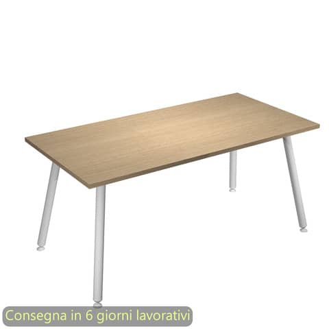 Scrivania della linea K67 Skinny Metal, una linea di arredo operativa dal design innovativo e dinamico, caratterizzata da gambe in metallo cilindriche inclinate. Dimensioni L. 180 x P. 80 x H. 74,4 cm. Materiale bilaminato nobilitato melaminico spessore 22 mm conforme norme UNI e EN classe E1. Robusto piano in melaminico sp. 22 mm con bordo antishock resistente agli urti in ABS 2 mm, antigraffio e antiriflesso. Gambe in metallo verniciato bianco (d. 50 mm) complete di piedini livellabili in altezza. Particolarmente stabile e robusta grazie alla struttura rafforzata da quattro travi in metallo di collegamento fra le gambe. Disponibile anche nella versione con le gambe in legno massello al codice ... Certificazioni FSC e PEFC. Colore del piano rovere.
