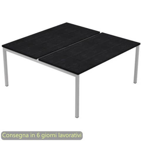 Scrivania bench con doppia postazione senza divisorio con gambe a ponte in metallo verniciato, sezione quadrata, della linea Venere Plus, una linea economica ma caratterizzata da soluzioni tecniche di livello superiore. Una serie di scrivanie con dimensioni conformi alle normative sulla sicurezza dei posti di lavoro in ufficio.Realizzata in materiale bilaminato nobilitato melaminico, con piano di spessore 22 mm, antigraffio e antiriflesso. Bordo dei piani in ABS antishock di 3 mm di spessore, antiurto e senza spigoli vivi. Gambe a sezione quadrata 40x40 mm, in metallo verniciato a polveri epossidiche di colore grigio alluminio, complete di piedini regolabili in altezza. Le gambe sono unite da una traversa in metallo centrale rispetto al piano. Non essendoci quindi gambe centrali c’è più libertà di movimentoÈ possibile collegare alle scrivanie di almeno 80 cm di larghezza un allungo laterale (reversibile destro/sinistro) sorretto da due gambe in metallo sezione 40x40 mm unite con una traversa in metallo alla trave centrale della scrivania. Corredate di distanziali fra desktop e fianchi per il passaggio dei cavi.Dimensioni 120x164xH.72,5 cm, finitura del piano di colore nero venato frassino. Peso totale imballi 59,5 kg. Pannello divisorio compatibile opzionale al codice 115704.Tutti i materiali utilizzati durante l'intero ciclo di produzione rispondono ai criteri imposti dalle normative vigenti. Artexport impiega nella lavorazione pannelli nobilitati in melaminico conformi alle norme UNI e EN classe E1 (Certificato CATAS, emissione di gas nocivi in caso di incendio). I pannelli sono certificati FSC e PEFC: sono ottenuti recuperando materiali legnosi di riciclo, con l'intento di contenere sia la produzione di rifiuti da discarica sia il fenomeno del disboscamento intensivo a fini industriali. Imballo a tutela dell'ambiente totalmente in cartone per un completo riciclo. Produzione interna certificata Iso 9001.Prodotto venduto in kit facilmente assemblabile dal cliente finale grazie alle intuitive istruzioni presenti in ogni imballo. Il processo di montaggio/smontaggio è reversibile e replicabile anche dal cliente, in maniera completamente autonoma. In caso di rottura di un singolo pezzo la modularità degli elementi ne consente la sostituzione senza dover ricorrere allo smaltimento dell’intero prodotto.