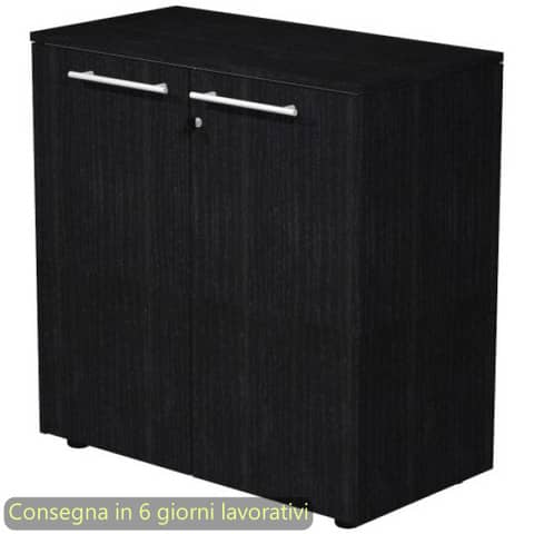 Armadio basso con top nero venato frassino, fianchi finitura e ante in melaminico con serratura. Struttura grigio alluminio. Top e fianchi di finitura con spessore 14 mm. Dimensioni: 82,8x43xH.81,4 cm. Produzione interna Artexport della parte in legno certificata Iso 9001. Certificazioni FSC e PEFC. Imballi totalmente in cartone per un facile riciclo, a basso impatto ambientale.