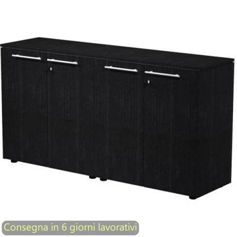 Copia armadi bassi con top nero venato frassino, fianchi finitura e ante in melaminico con serratura. Struttura grigio alluminio.Top e fianchi di finitura con spessore 14 mm. Dimensioni: 162,8x43xH.81,4 cm. Produzione interna Artexport della parte in legno certificata Iso 9001. Certificazioni FSC e PEFC. Imballi totalmente in cartone per un facile riciclo, a basso impatto ambientale.