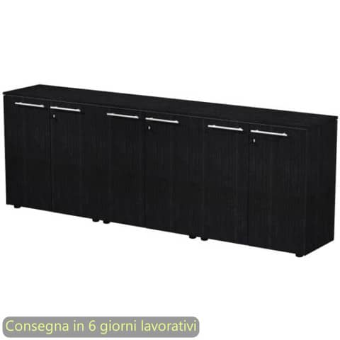 Composizione da tre armadi bassi con tre coppie di ante melaminico con serratura. Top e fianchi di finitura con spessore 14 mm. Colore: nero venato frassino. Dimensioni: 242,8x43xH.81,4 cm. Produzione interna Artexport della parte in legno certificata Iso 9001. Certificazioni FSC e PEFC. Imballi totalmente in cartone per un facile riciclo, a basso impatto ambientale.