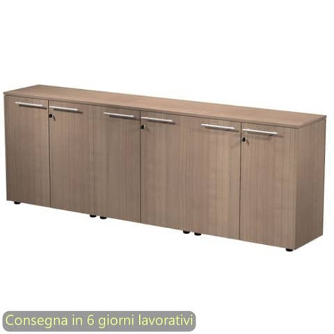 Composizione da tre armadi bassi con tre coppie di ante melaminico con serratura. Top e fianchi di finitura con spessore 14 mm. Colore: ciliegio arabis. Dimensioni: 242,8x43xH.81,4 cm. Produzione interna Artexport della parte in legno certificata Iso 9001. Certificazioni FSC e PEFC. Imballi totalmente in cartone per un facile riciclo, a basso impatto ambientale.