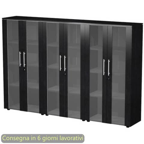 Composizione da tre mobili medio/alti con tre coppie di ante vetro/melaminico con serratura. Colore: nero venato frassino. Top e fianchi finitura spessore 14 mm. Dimensioni: 162,8x43xH.158,2 cm. Produzione interna Artexport della parte in legno certificata Iso 9001. Certificazioni FSC e PEFC. Imballi totalmente in cartone per un facile riciclo, a basso impatto ambientale.