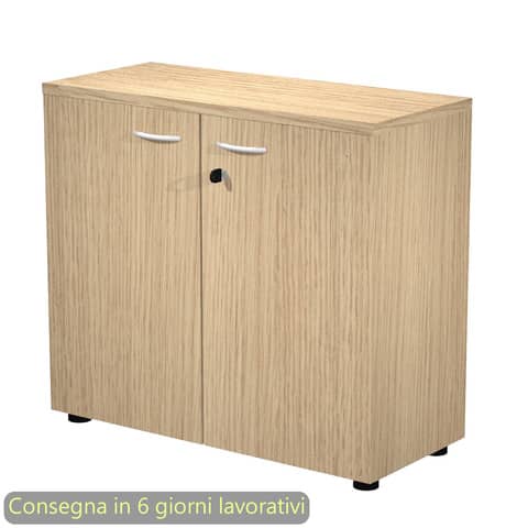 Armadio basso con ante battenti con serratura. Struttura bianca e ante rovere. Dimensioni: 90x46xH.85 cm. 1 ripiano regolabile. Ripiano: 25 mm. Struttura: 18 mm. Dietro: 10 mm. Realizzati in robusto melaminico bilaminato antigraffio ed antiriflesso conforme alle norme UNI e EN classe E1. Ante battenti basse in melaminico bilaminato (sp. 18 mm, con serratura ). Maniglie in ABS antiurto finitura alluminio. Profondità utile dei ripiani 425 mm. Rifiniti posteriormente possono essere utilizzati come pareti divisorie. Dotati di piedini regolabili in altezza per un perfetto livellamento. Colori strutture: bianco, noce chiaro, grigio e rovere. Colori ante: bianco, noce chiaro, grigio, rovere, faggio e rovere canadese.