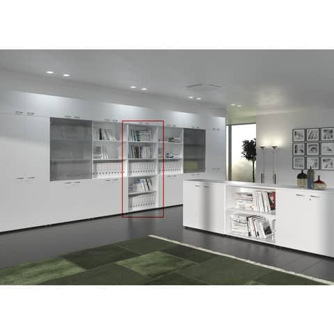 Realizzato in robusto melaminico bilaminato antigraffio ed antiriflesso. Struttura di spessore 18 mm. Dotato di 4 solidi ripiani ad alto spessore (25 mm), 3 riposizionabili ed 1 fisso (il secondo dal basso). Profondità utile dei ripiani 42,5 cm. Rifinito posteriormente, con spessore del dietro rigido di 10 mm, può essere utilizzato come parete divisoria. Dotato di piedini regolabili in altezza per un perfetto livellamento col pavimento.