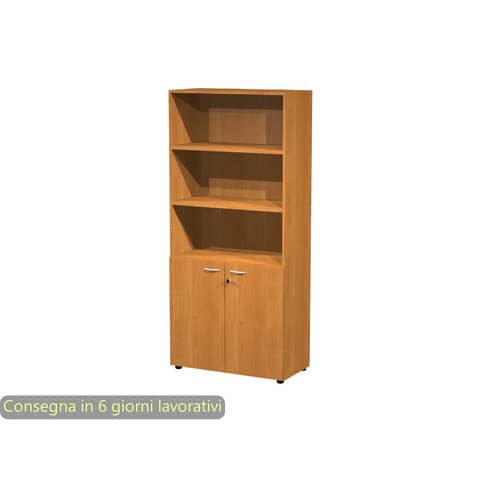 Realizzato in robusto melaminico bilaminato antigraffio ed antiriflesso, con ante basse battenti in melaminico spessore 18 mm, con serratura. Struttura di spessore 18 mm. Maniglie in ABS antiurto finitura alluminio. Dotato di 4 solidi ripiani ad alto spessore (25 mm), 3 riposizionabili ed 1 fisso (il secondo dal basso). Profondità utile dei ripiani 42,5 cm. Rifinito posteriormente, con spessore del dietro rigido di 10 mm, può essere utilizzato come parete divisoria. Dotato di piedini regolabili in altezza per un perfetto livellamento col pavimento.