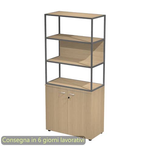 Libreria in metallo media con struttura antracite opaco e ripiani rovere chiaro, sovrapposta ad armadio basso rovere con ante rovere. Libreria in metallo a tre vani di dimensioni: 90x44xH.119 cm con struttura 20x20 mm a giorno con ripiani, base, cappello e un dietro in melaminico; sovrapposta ad un armadio basso di dimensioni: 90x44xH.85 cm completo di ante battenti con serratura. Libreria metallo completa di n°1 dietro in melaminico posizionabile a scelta nel vano superiore o in quello inferiore. Linea Blade. Dimensioni: 90x46xH.165 cm. Produzione interna Artexport della parte in legno certificata Iso 9001. Certificazioni FSC e PEFC. Imballi totalmente in cartone per un facile riciclo, a basso impatto ambientale.
