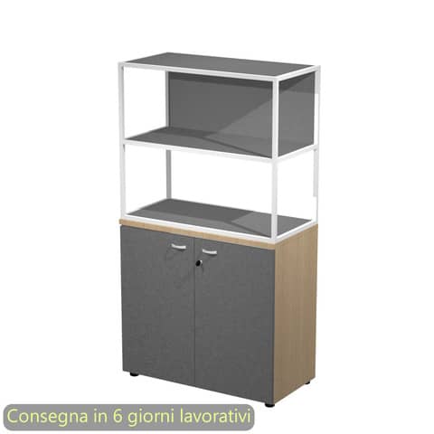 Libreria in metallo bassa con struttura bianco opaco e ripiani antracite laguna, sovrapposta ad armadio basso rovere con ante antracite. Libreria in metallo a due vani di dimensioni: 90x44xH.80 cm con struttura 20x20 mm a giorno con ripiani, base, cappello e un dietro in melaminico; sovrapposta ad un armadio basso di dimensioni: 90x44xH.85 cm completo di ante battenti con serratura. Libreria metallo completa di n°1 dietro in melaminico posizionabile a scelta nel vano superiore o in quello inferiore. Linea Blade. Dimensioni: 90x46xH.165 cm. Nel mobile basso è presente un ripiano intermedio di sp. 25 mm (nella posizione intermedia il vano superiore è alto 378 mm e quello inferiore 377 mm). Produzione interna Artexport della parte in legno certificata Iso 9001. Certificazioni FSC e PEFC. Imballi totalmente in cartone per un facile riciclo, a basso impatto ambientale.