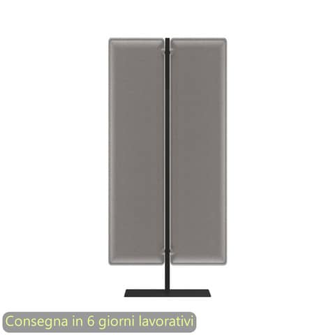 Piantana/divisorio mobile con pannelli fonoassorbenti grigi, struttura nero opaco. Linea Woody. Base 60x30 cm. N°2 pannelli 120x40 cm. Dimensioni: L.83,8xH.140 cm. Imballo in cartone riciclato a tutela dell'ambiente. Produzione certificata conforme procedure UNI EN ISO 9001. Pannelli divisori acustici fonoassorbenti certificati. Progettati per aumentare il benessere nell’ambiente di lavoro e per definire aree nelle quali conciliare operatività e privacy. I pannelli sono realizzati in fibra di poliestere termoformata e si compongono di più strati accoppiati di densità variabile con tessuto esterno Mirage. La densità variabile ottenuta attraverso la termoformatura del materiale consente l’assorbimento di un più ampio spettro di lunghezze d’onda, contrariamente a quanto accade con schermi divisori tradizionali. Per creare un buon ambiente acustico è infatti fondamentale garantire tre caratteristiche: assorbimento, diffusione e attenuazione. Moody, con le sue proprietà, incide su questi tre fronti, riuscendo a garantire un ambiente sonoro equilibrato. Gli angoli arrotondati dei pannelli ne addolciscono le forme ed eliminano gli spigoli pericolosi in caso di urto accidentale. I pannelli sono un prodotto ecologico perché ottenuti da materiale riciclato e a sua volta riciclabile.