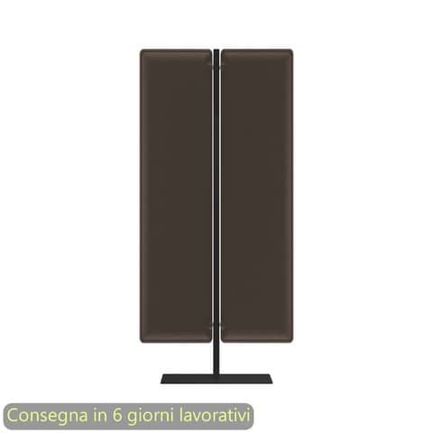 Piantana/divisorio mobile con pannelli fonoassorbenti antracite, struttura nero opaco. Linea Woody. Base 60x30 cm. N°2 pannelli 120x40 cm. Dimensioni: L.83,8xH.140 cm. Imballo in cartone riciclato a tutela dell'ambiente. Produzione certificata conforme procedure UNI EN ISO 9001. Pannelli divisori acustici fonoassorbenti certificati. Progettati per aumentare il benessere nell’ambiente di lavoro e per definire aree nelle quali conciliare operatività e privacy. I pannelli sono realizzati in fibra di poliestere termoformata e si compongono di più strati accoppiati di densità variabile con tessuto esterno Mirage. La densità variabile ottenuta attraverso la termoformatura del materiale consente l’assorbimento di un più ampio spettro di lunghezze d’onda, contrariamente a quanto accade con schermi divisori tradizionali. Per creare un buon ambiente acustico è infatti fondamentale garantire tre caratteristiche: assorbimento, diffusione e attenuazione. Moody, con le sue proprietà, incide su questi tre fronti, riuscendo a garantire un ambiente sonoro equilibrato. Gli angoli arrotondati dei pannelli ne addolciscono le forme ed eliminano gli spigoli pericolosi in caso di urto accidentale. I pannelli sono un prodotto ecologico perché ottenuti da materiale riciclato e a sua volta riciclabile.