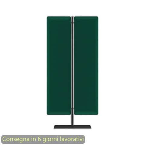 Piantana/divisorio mobile con pannelli fonoassorbenti verde bosco, struttura nero opaco. Linea Woody. Base 60x30 cm. N°2 pannelli 120x40 cm. Dimensioni: L.83,8xH.140 cm. Imballo in cartone riciclato a tutela dell'ambiente. Produzione certificata conforme procedure UNI EN ISO 9001. Pannelli divisori acustici fonoassorbenti certificati. Progettati per aumentare il benessere nell’ambiente di lavoro e per definire aree nelle quali conciliare operatività e privacy. I pannelli sono realizzati in fibra di poliestere termoformata e si compongono di più strati accoppiati di densità variabile con tessuto esterno Mirage. La densità variabile ottenuta attraverso la termoformatura del materiale consente l’assorbimento di un più ampio spettro di lunghezze d’onda, contrariamente a quanto accade con schermi divisori tradizionali. Per creare un buon ambiente acustico è infatti fondamentale garantire tre caratteristiche: assorbimento, diffusione e attenuazione. Moody, con le sue proprietà, incide su questi tre fronti, riuscendo a garantire un ambiente sonoro equilibrato. Gli angoli arrotondati dei pannelli ne addolciscono le forme ed eliminano gli spigoli pericolosi in caso di urto accidentale. I pannelli sono un prodotto ecologico perché ottenuti da materiale riciclato e a sua volta riciclabile.