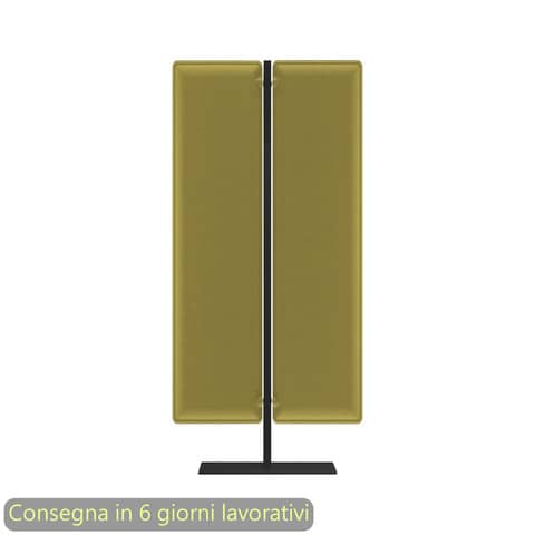 Piantana/divisorio mobile con pannelli fonoassorbenti verde acido, struttura nero opaco. Linea Woody. Base 60x30 cm. N°2 pannelli 120x40 cm. Dimensioni: L.83,8xH.140 cm. Imballo in cartone riciclato a tutela dell'ambiente. Produzione certificata conforme procedure UNI EN ISO 9001. Pannelli divisori acustici fonoassorbenti certificati. Progettati per aumentare il benessere nell’ambiente di lavoro e per definire aree nelle quali conciliare operatività e privacy. I pannelli sono realizzati in fibra di poliestere termoformata e si compongono di più strati accoppiati di densità variabile con tessuto esterno Mirage. La densità variabile ottenuta attraverso la termoformatura del materiale consente l’assorbimento di un più ampio spettro di lunghezze d’onda, contrariamente a quanto accade con schermi divisori tradizionali. Per creare un buon ambiente acustico è infatti fondamentale garantire tre caratteristiche: assorbimento, diffusione e attenuazione. Moody, con le sue proprietà, incide su questi tre fronti, riuscendo a garantire un ambiente sonoro equilibrato. Gli angoli arrotondati dei pannelli ne addolciscono le forme ed eliminano gli spigoli pericolosi in caso di urto accidentale. I pannelli sono un prodotto ecologico perché ottenuti da materiale riciclato e a sua volta riciclabile.