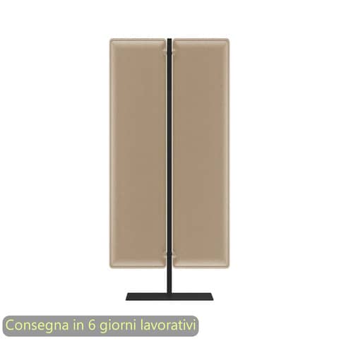 Piantana/divisorio mobile con pannelli fonoassorbenti avorio, struttura nero opaco. Linea Woody. Base 60x30 cm. N°2 pannelli 140x40 cm. Dimensioni: L.83,8xH.160 cm. Imballo in cartone riciclato a tutela dell'ambiente. Produzione certificata conforme procedure UNI EN ISO 9001. Pannelli divisori acustici fonoassorbenti certificati. Progettati per aumentare il benessere nell’ambiente di lavoro e per definire aree nelle quali conciliare operatività e privacy. I pannelli sono realizzati in fibra di poliestere termoformata e si compongono di più strati accoppiati di densità variabile con tessuto esterno Mirage. La densità variabile ottenuta attraverso la termoformatura del materiale consente l’assorbimento di un più ampio spettro di lunghezze d’onda, contrariamente a quanto accade con schermi divisori tradizionali. Per creare un buon ambiente acustico è infatti fondamentale garantire tre caratteristiche: assorbimento, diffusione e attenuazione. Moody, con le sue proprietà, incide su questi tre fronti, riuscendo a garantire un ambiente sonoro equilibrato. Gli angoli arrotondati dei pannelli ne addolciscono le forme ed eliminano gli spigoli pericolosi in caso di urto accidentale. I pannelli sono un prodotto ecologico perché ottenuti da materiale riciclato e a sua volta riciclabile.