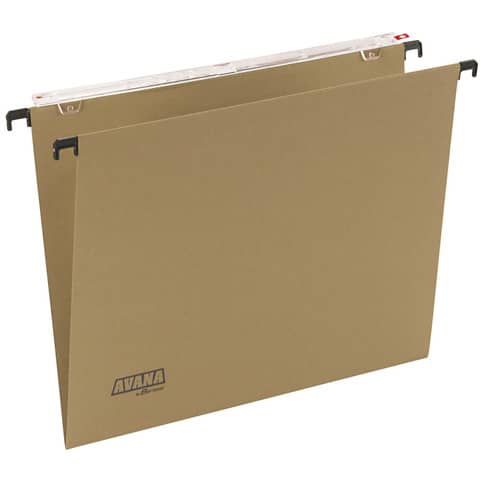 Cartelle sospese economiche e rispettose della natura.Realizzate in cartoncino Manilla, 100% riciclato post-consumo, dal peso di 220 gr/mq. Aste di sospensione in filo d'acciaio armonico (80% riciclato) con ganci di scorrimento in polistirene nero. Sistema di assemblaggio tramite colla a caldo.Portaetichette già montato in plastica trasparente ad effetto lenticolare lungo 29 cm. Sistema di collegamento in continuo delle cartelle ad incastro. Etichette con bordo colorato per l’immediata individuazione dei fascicoli.Interasse 39 cm. fondo a V. Conf. 50 p.zi - Colore Avana.Garanzia Prodotto: 3 anni.