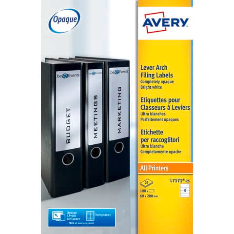Etichette bianche in carta Ultragrip™ specifiche per raccoglitori, adatte a stampanti Laser. Cercare documenti può diventare una vera perdita di tempo. Ma puoi evitarla e trovare i tuoi documenti rapidamente mantenendo in ordine il tuo archivio, con raccoglitori ben etichettati. Sceglie le etichette per raccoglitori di Avery facili da stampare e personalizzare grazie al software e modelli gratuiti di Avery. Inoltre grazie alla finitura coprente ti permettono di riutilizzare vecchi raccoglitori e cartelline. Adatte a diversi formati di raccoglitori. Formato 60x200 mm, 4 etichette per foglio, confezione da 25 fogli, 100 etichette complessive per confezione, adatte a raccoglitori dorso largo (6 cm). Realizzate con una speciale carta coprente BlockOUT® che ti consente di coprire scritte ed etichette precedentemente applicate su raccoglitori o cartelline. Grazie alla tecnologia Ultragrip™ ottieni stampe perfettamente allineate, senza inceppamenti e senza sprechi. Adesivo permanente, aderiscono tenacemente al dorso dei raccoglitori. Realizzate con carta certificata FSC® proveniente da foreste gestite in modo responsabile.