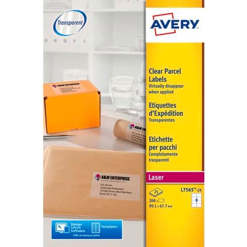 Etichette trasparenti lucide in poliestere QuickPEEL™, per stampanti Laser. Devi etichettare buste o pacchi colorati e vuoi che si differenzino da tutte le altre? Utilizza le etichette trasparenti per indirizzi per buste e pacchi. Una volta applicata l'etichetta su una busta o un pacco colorato questa risulta completamente invisibile, si vede solo ciò che vi è stampato sopra. Facili da stampare con il software e i modelli preimpostati gratuiti Avery Crea & Stampa. Formato 99,1x67,7 mm, 8 etichette per foglio, confezione da 25 fogli, 200 etichette per confezione. Facili da rimuovere e applicare grazie alla tecnologia QuickPEEL™ che libera un lato dell’etichetta e rende l’etichettatura più veloce. Adesivo permanente, perfetto per essere applicato su vetro, metallo, cartone e plastica. Finitura lucida che dona un aspetto curato e professionale ai prodotti. La soluzione ideale per mettere in risalto messaggi importanti e dare un tocco professionale alle tue creazioni. Ø 40 Mm 45,7x25,4 Mm