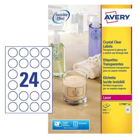 Etichette trasparenti lucide in poliestere QuickPEEL™, per stampanti Laser. Devi etichettare buste o pacchi colorati e vuoi che si differenzino da tutte le altre? Utilizza le etichette trasparenti per indirizzi per buste e pacchi. Una volta applicata l'etichetta su una busta o un pacco colorato questa risulta completamente invisibile, si vede solo ciò che vi è stampato sopra. Facili da stampare con il software e i modelli preimpostati gratuiti Avery Crea & Stampa. Formato Ø 40 mm, 24 etichette per foglio, confezione da 25 fogli, 600 etichette per confezione. Facili da rimuovere e applicare grazie alla tecnologia QuickPEEL™ che libera un lato dell’etichetta e rende l’etichettatura più veloce. Adesivo permanente, perfetto per essere applicato su vetro, metallo, cartone e plastica. Finitura lucida che dona un aspetto curato e professionale ai prodotti. La soluzione ideale per mettere in risalto messaggi importanti e dare un tocco professionale alle tue creazioni. 99,1x67,7 Mm 45,7x25,4 Mm