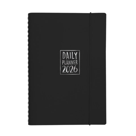 Agenda giornaliera spiralata Biembi 2026. Con copertina in elegante cuoio rigenerato con stampa argento. Elastico verticale rotondo, tono su tono. Interno personalizzato con citazioni e aforismi “Un giorno tira l’altro” per ogni mese. Cellofanata singolarmente e dotata di foglietto esplicativo del contenuto e barcode sul retro. Dimensioni 15x21 cm. Colore nero.