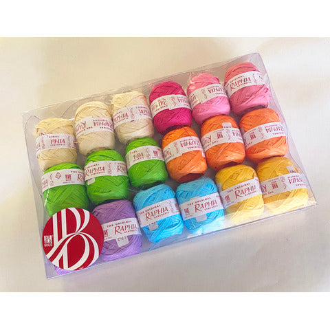 Confezione composta da 18 bobine da 20 metri di raphia synthetic. Assortimento composto da 2 pezzi per colore: giallo, azzurro, lavanda, arancio, verde, rosa, magenta, avorio e rosa fluo.