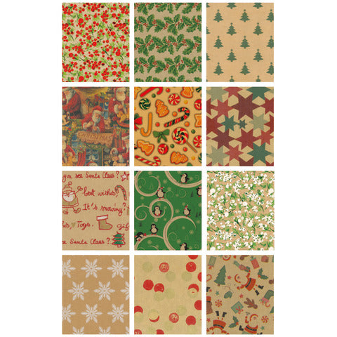 Blister composto da 50 fogli di carta regalo in fantasie natalizie assortite nei colori: riga rossa, riga verde, stella argento, oro, blu reale, oro e rosso. Carta 100% cellulosa patinata. Formato: 70 x 100 cm, avana.