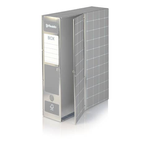 Scatola con cerniera in metallo f.to 37,5x29,5. Dorso 9 con apertura parziale realizzata in robusto cartone rivesto in carta stampata con finitura vetrificata. La struttura di questo prodotto permette di essere archiviato sia in verticale che in orizzontale sovrapponendolo. Colore: grigio.