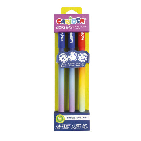 Penna cancellabile Carioca Oops Easy punta media 0,7 mm. In confezione da 3: 2 blu e 1 rosso.