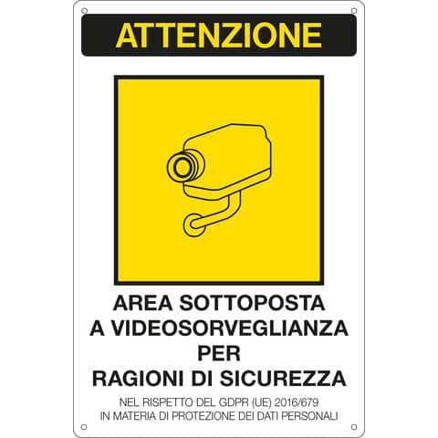 Cartello area video ''Area sottoposta a videosorveglianza (D. LGS. n. 101 10/08/18)''. Immagine gialla. Alluminio spessore 5/10. Dimensioni: 20x30 cm