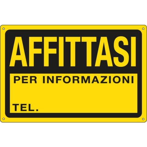 Cartello informativo ''Affittasi''. Scritta nera su fonda giallo. Polipropilene. Spessore 5/10. Dimensioni: 30x20 cm
