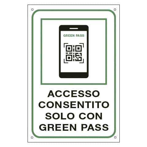 Cartello informativo ''Accesso consentito solo con il Green Pass''. Alluminio spessore 5/10. Dimensioni: 30x20 cm