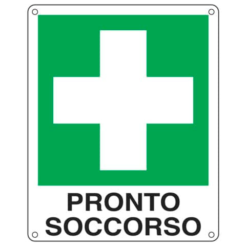 Cartello d'emergenza ''Pronto soccorso''. Sfondo bianco con immagini verdi. UNI ISO 7010. Alluminio piano spessore 5/10. Dimensioni: 12x14,5 cm