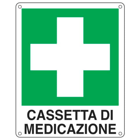 Cartello d'emergenza ''Cassetta di medicazione''. Sfondo bianco con immagini verdi. UNI ISO 7010. Alluminio piano spessore 5/10. Dimensioni: 16x21 cm