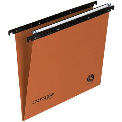 Cartelle sospese di ottima qualità, elevata convenienza e rispettose della natura.La percentuale in peso di materiale riciclato è superiore al 95% ed il marchio Der Blauer Engel apposto sul prodotto garantisce il rispetto dei massimi requisiti di sostenibilità ambientale.Fabbricate con i migliori materiali e le migliori tecniche produttive, sono garantite 10 anni.Realizzate in cartoncino Kraft robusto (peso di 240 gr/mq.) ed ecologico (100% riciclato post-consumo) certificato Blauer Engel.Aste di sospensione in polistirene nero antiurto, molto resistenti (spessore 6 mm.) ed ecologiche (90% riciclato post-consumo). Sistema di assemblaggio tramite rivetti metallici che garantisce i massimi requisiti in termini di resistenza e durata.Portaetichette già montato in plastica trasparente con effetto lenticolare (100% riciclato post-industriale) lungo 31 cm.Etichette con bordo colorato per l’immediata individuazione dei fascicoli.Interasse 38 cm. fondo ad V. Conf. 50 p.zi - Colore ArancioCertificazione Prodotto: Der Blauer Engel.Garanzia Prodotto: 10 anni.33 Cm 39 Cm