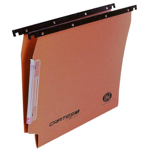 Cartelle sospese di ottima qualità, elevata convenienza e rispettose della natura.La percentuale in peso di materiale riciclato è superiore al 95% ed il marchio Der Blauer Engel apposto sul prodotto garantisce il rispetto dei massimi requisiti di sostenibilità ambientale.Fabbricate con i migliori materiali e le migliori tecniche produttive, sono garantite 10 anni.Realizzate in cartoncino Kraft robusto (peso di 240 gr/mq.) ed ecologico (100% riciclato post-consumo) certificato Blauer Engel.Aste di sospensione in polistirene nero antiurto, molto resistenti (spessore 6 mm.) ed ecologiche (90% riciclato post-consumo). Sistema di assemblaggio tramite rivetti metallici che garantisce i massimi requisiti in termini di resistenza e durata.Portaetichette già montato in plastica trasparente con effetto lenticolare (100% riciclato post-industriale) lungo 14 cm. Sistema di collegamento in continuo delle cartelle ad incastro per prevenire eventuali perdite od errata classificazione dei documenti.Etichette con bordo colorato per l’immediata individuazione dei fascicoli.L’incavo frontale agevola l’inserimento/prelievo dei documenti.Interasse 33 cm. fondo ad V. Conf. 50 p.zi - Colore Arancio.Certificazione Prodotto: Der Blauer Engel.Garanzia Prodotto: 10 anni.Fondo U 3 Cm