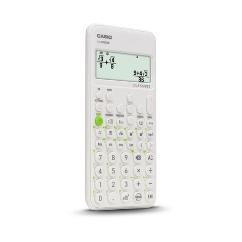 Calcolatrice scientifica serie ClassWiz ideale per la Scuola Secondaria I grado con Display ''Natural Textbook Display'' Natural V.P.A.M, LCD e Menù ad icone. AMMESSA all’esame di maturità e con 3 anni di garanzia. Dotata di 274 funzioni tra cui: funzione di ripetizione, 24 livelli di parentesi, memorie variabili, funzioni trigonometriche e trigonometriche inverse, iperboliche e iperboliche inverse, calcolo di potenza/radice, calcoli logaritmici, esponenziali, radicali, calcolo combinatorio e permutazione, scomposizione in fattori primi, generatore di numeri casuali, conversione di coordinate polari in coordinate rettangolari e viceversa, calcolo automatico delle frazioni (due modi), conversione di valori sessagesimali in valori decimali e viceversa, calcolo in gradi centesimali, gradi sessagesimali e radianti, funzione SCI/FIX/ENG, statistiche a 1 e a 2 variabili. Alimentazione: batteria (1xAAA). Dimensioni LxPxH: 77x14x166 mm. Peso: 90 g.