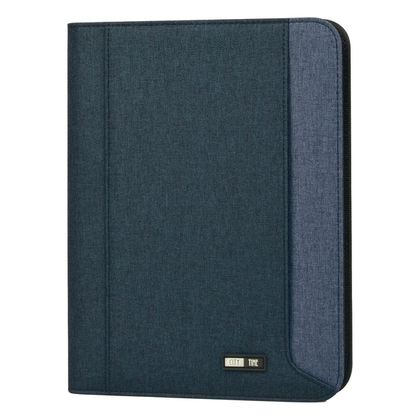 Portablocco in tessuto tecnico bicolore. Formato a4, chiusura con zip, scomparti per biglietti, tasca interna portadocumenti, portapenna, completo di blocco. Dimensioni 26x34cm.